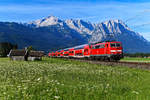 Blühende Wiesen, Berge, blauer Himmer und eine 111. Das ist ein echtes bayerisches Eisenbahnbild. Wunderbar.