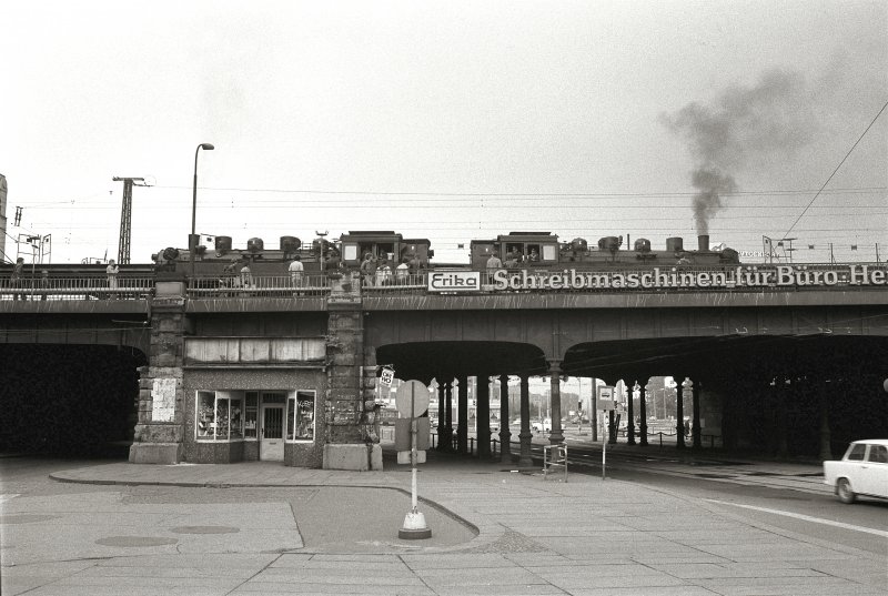 Doppeltraktion BR 86 auf der alten Brücke am Hauptbahnhof DRESDEN 1985 (zum Bild)
