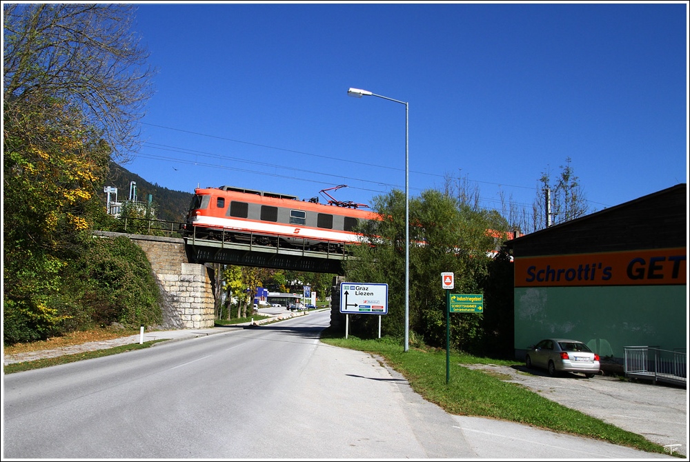 Unter der Grünhüblbrücke fährt 1116 038 "Siemens" mit einem Güterzug in Richtung Bruck an der Mur. Judenburg 15.10.2010 (zum Bild)