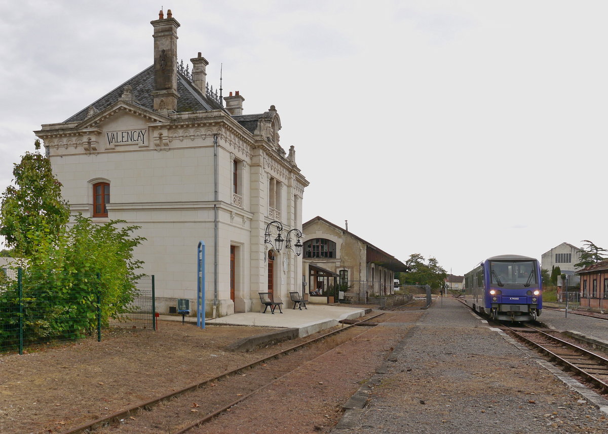 Der Meterspur-Dieseltriebzug SNCF-X74502 steht im malerischen Bahnhof von Valençay bereit um als TER61254 von Valencay nach Romorantin zu fahren. Der Bahnhof Valençay ist seit einigen Jahren der Endpunkt der regelmäßigen Züge auf der Meterspurstrecke der Chemin de fer du Blanc-Argent im Zentrum Frankreichs. Die weiterführende Strecke ist gesperrt und nicht befahrbar. 2014-09-17 784 Valençay (zum Bild)