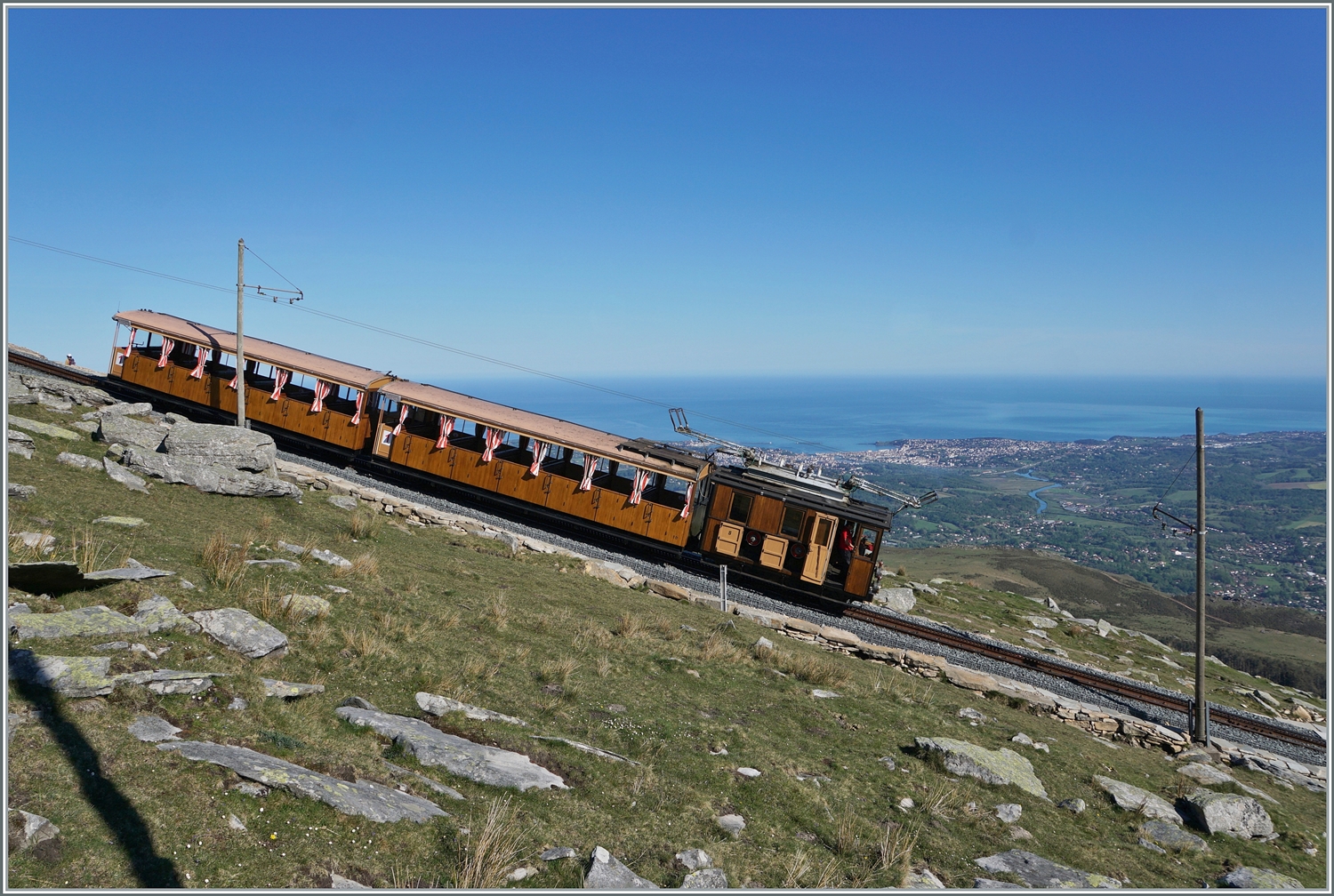 Frankreich bietet nicht nur schnelle Züge, sondern auch sehr gemütliche: Kurz nach der Gipfelstation La Rhume (905 müM) ist die 1914 von der SLM/BBC gebaute Chemin der fer de la Rhune He 2/2 mit Vmax 9 km/h mit ihrem ersten Zug des Tages auf der Fahrt ins "Tal", wobei mit "Talstation" der Passübergang Col de Saint-Ignace auf 198 müM gemeint ist. Im Hintergrund gleitet Blick über den mächtigen Atlantik sowie die beiden Orte Ciboure und Saint-Jean-de-Luz. 12. April 2024 (zum Bild)