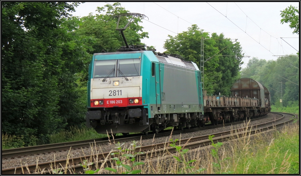 Die belgische 2811 (Cobra) legt sich mit ihren Güterzug bei Rimburg in den Gleisbogen. Bildlich festgehalten an der Kbs 485 am 27.Juni 2015. (zum Bild)