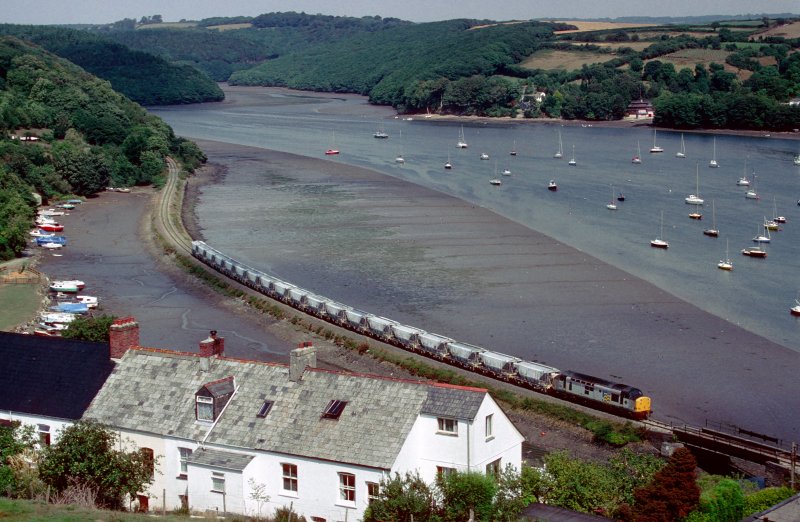In Cornwall gibt es noch eine Kaolinindustrie. Die Bahn wird noch als Verkehrsmittel zwischen den Bergwerken und dem Hafen in Fowey sowie anderen Kunden in Grossbritanien verwendet. Am 9. August 1995 fuhr 37521 auf dem Weg nach Fowey an Golant vorbei. (zum Bild)