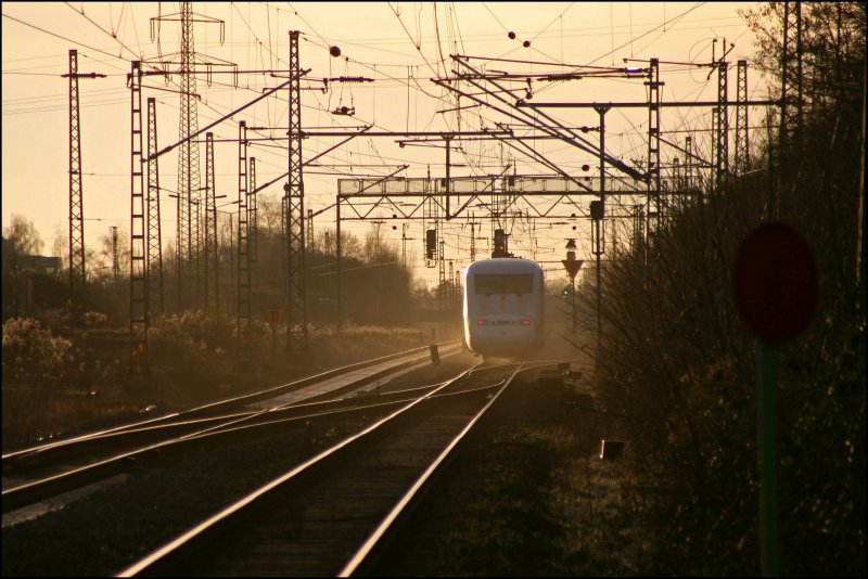 Nachschuss auf den ICE 927, von Kiel Hbf nach München Hbf der bei Dortmund-Kirchderne dem Sonnenuntergang entgenfährt. Links im Bild stand bis vor einigen Jahren die "Westfalenhütte", die nun in China Stahlkocht..... (03.02.2008) (zum Bild)
