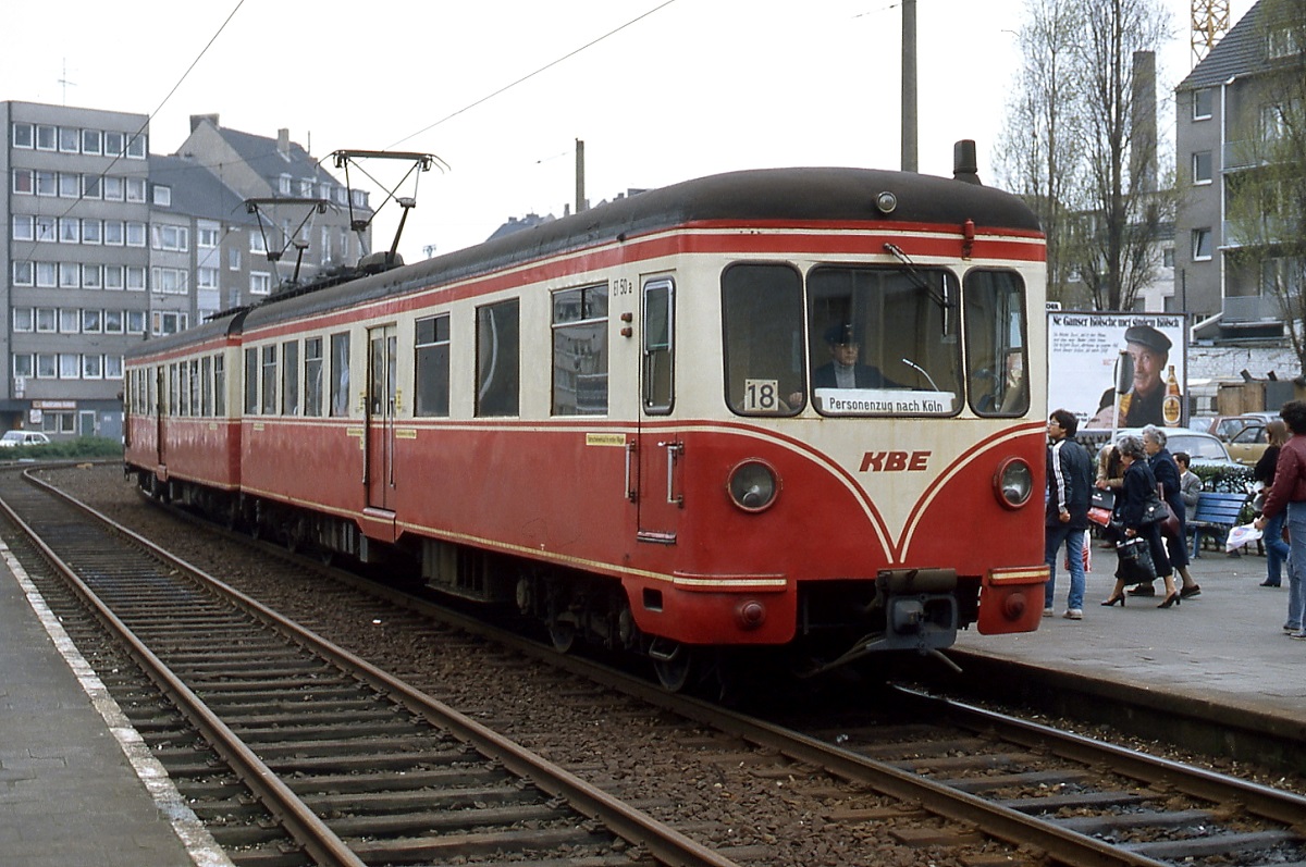 An einem Februartag Anfang der 1980er Jahre trifft der KBE-ET 50 mit einem Personenzug aus Bonn im Kölner Vorgebirgsbahnhof am Barbarossaplatz ein (voir l'image)