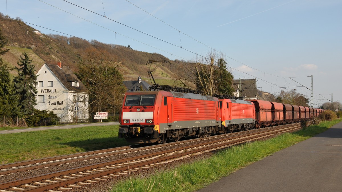 189 042-5 und Schwesterlok unterwegs Richtung Köln auf der linken Rheinstrecke. Aufgenommen am 09/04/2015 in Leutesdorf. (alla foto)