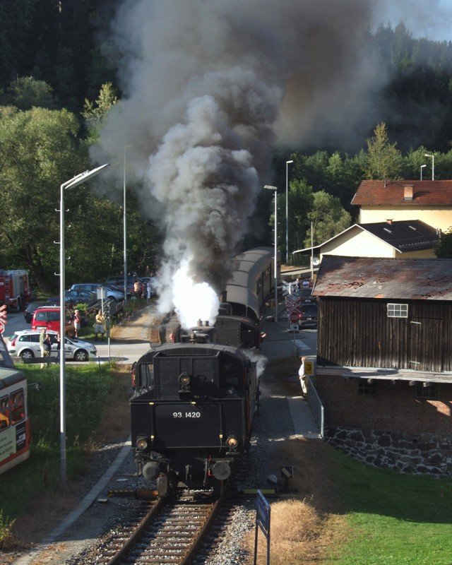 Der Dampfsonderzug anlässlich des Jubiläums 120 Jahre Mühlkreisbahn (Linz Urfahr - Aigen-Schlägl, Oberösterreich) verlässt auf dem Foto nicht Neuhofen, sondern Neufelden!