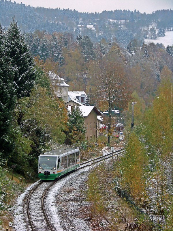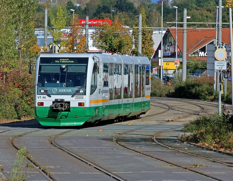 @Silvan: Der VT ist der RegioSprinter der Vogtlandbahn, der auf der Strecke Zwickau Zentrum - Zwickau Hbf als Straßenbahn fährt (mit Blinker, Glocke und alles, was sonst noch dazugehört!), dem Karlsruher Modell abgeguckt, nur umgekehrt... Auf der restlichen Strecke nach Falkenstein - Klingenthal - Graslitz/Kraslice - Falkenau/Sokolov (- Karlsbad/Karlovy Vary - Marienbad/Marianske Lazne) und weiteren Linien fährt er dann als RB auf "normalen" Gleisen!
