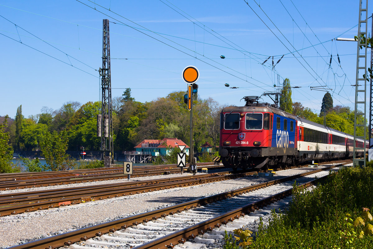 421 394-8 zieht ihren EuroCity aus Zürich über den Lindauer Bahndamm entlang. 30.4.17 (alla foto)