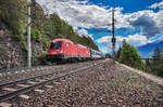1116 277-5 fährt mit dem EC 112 (Klagenfurt Hbf - Frankfurt (Main) Hbf) die Tauernbahn-Südrampe hinauf. An zweiter Stelle im Zug eingereiht, befand sich ein nightjet-Sitzwagen. Aufgenommen am 14.5.2017, kurz vor dem Ochenigtunnel, bei Obervellach. (Fotostandort öffentlich auf asphaltiertem Platz) (alla foto)