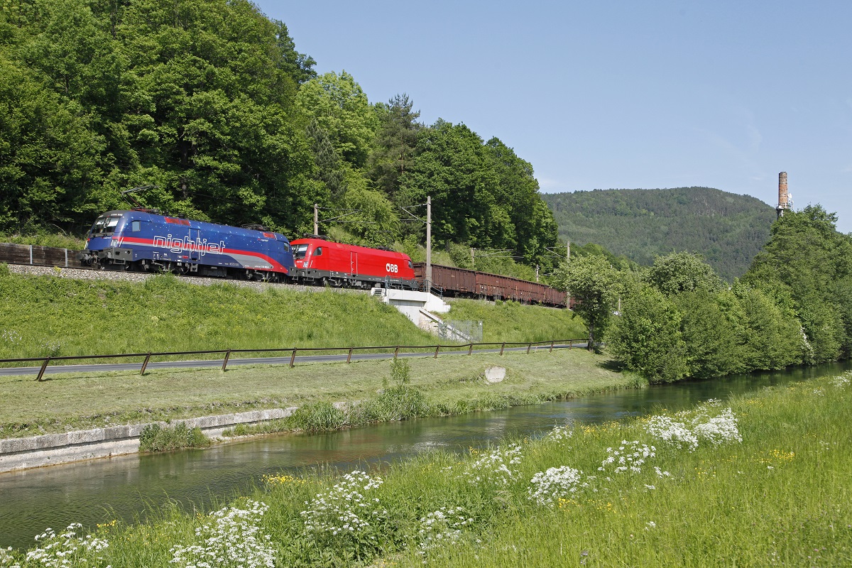 Zusätzlich zur Planlok 1216 233 wurde bei RJ75 am 23.05.2017 die 1216 210 kalt mitgeschleppt ,was die Optik des Zuges sehr störte. Das Bild entstand zwischen Bruck an der Mur un Pernegg. (zum Bild)
