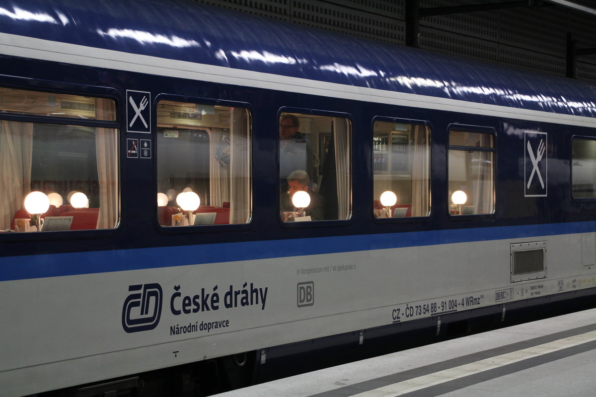 Im eleganten Blau zeigt sich der Speisewagen der České dráhy. Eingereiht ist er im EC 179 (Hamburg Altona - Praha hl.n.). Berlin Hbf, 14. Dezember 2016 (zum Bild)