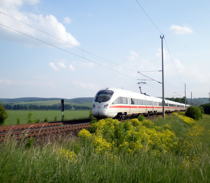 Fernverkehr ist auf der KBS 595 nicht alltäglich zu beobachten. Hier ist ICE 1653 Frankfurt Flughafen - Dresden am 24.05.2008 nähe des BÜ km 15,5 zwischen Reinsdorf (b Artern) und Artern unterwegs. (zum Bild)
