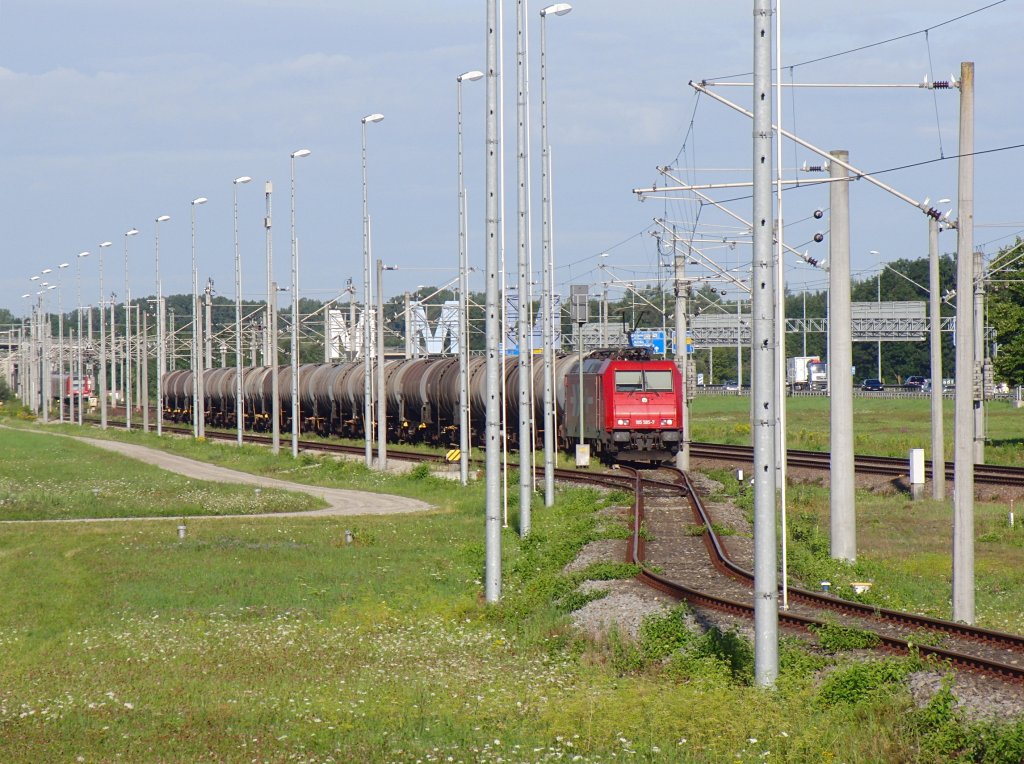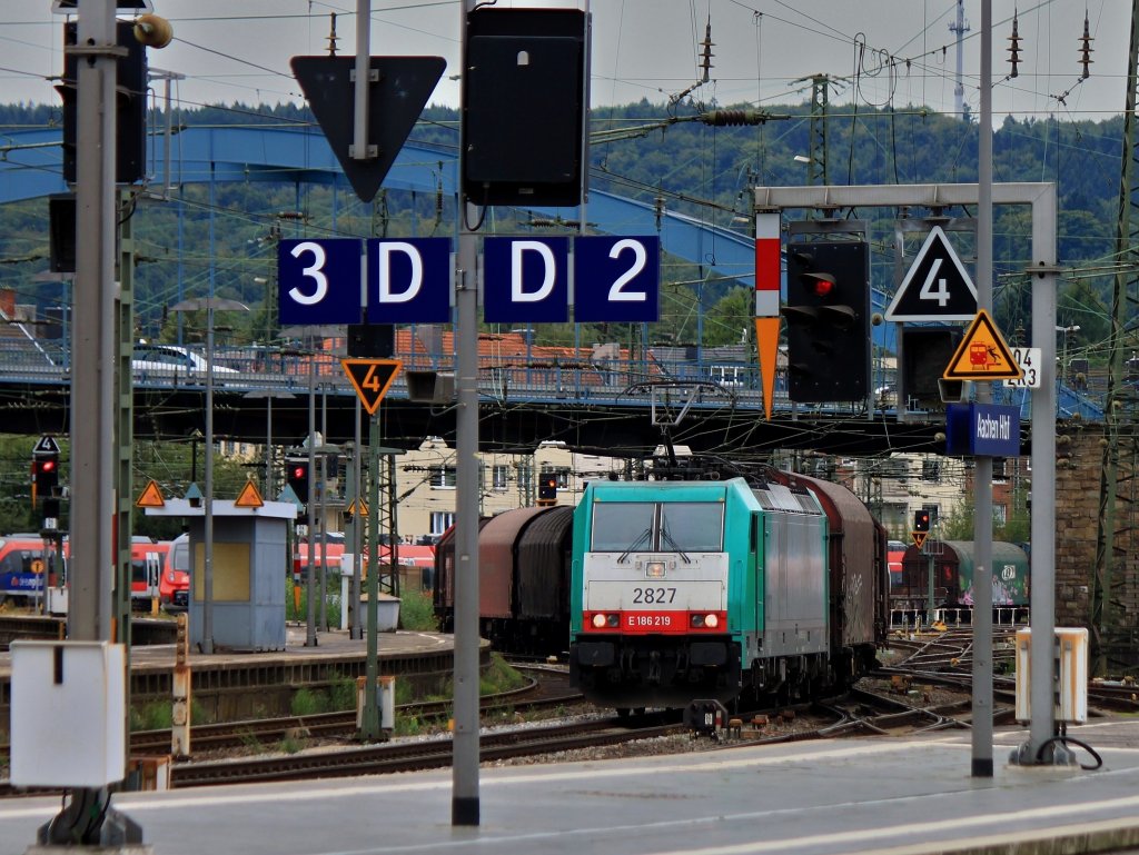 Cobra 186 219 (2827) schlängelt sich am 15.09.2012 mit einem gemischten Güterzug von Aachen West kommend unter der Burtscheider Brücke durch das Gleisvorfeld des Aachener Hbf. (zum Bild)