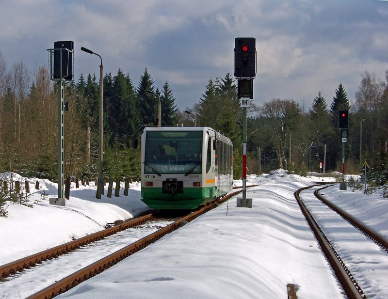 Mein 100. Bild auf Bahnbilder.de zeigt VT48 ("St. Ulrich Weischlitz") als VBG83146 in Zwotental, 20.3.09. (zum Bild)