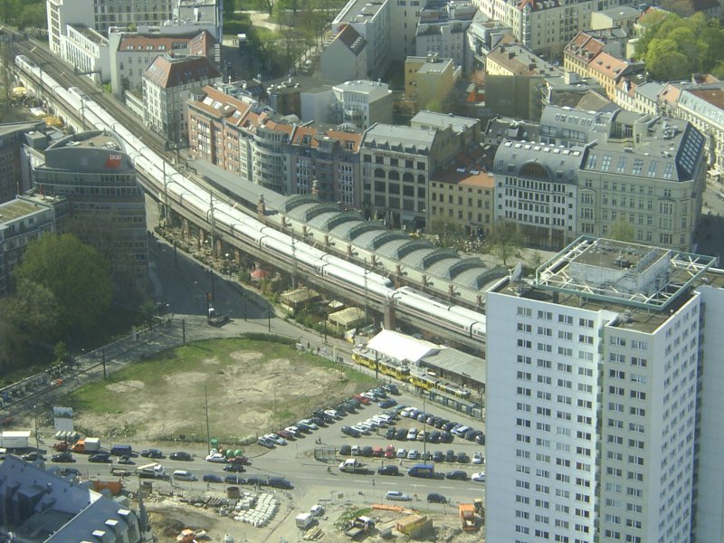 Weiße Stadtbahn Berlin: Auf dem rechten Streckengleis eine Doppelgarnitur ICE 2, in der Gegenrichtung ein wartender ICE 1, 23.4.08. (zum Bild)