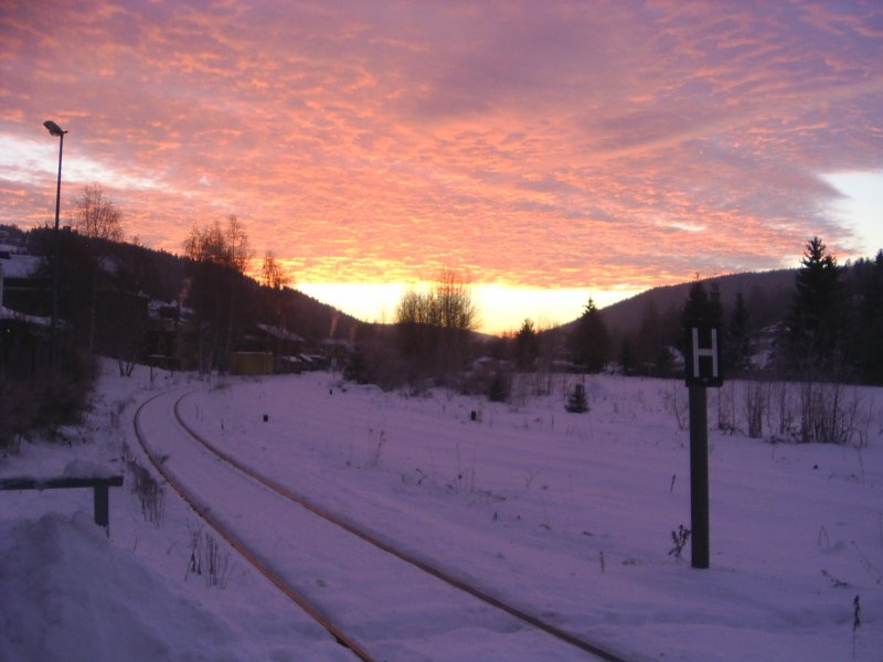 Winterlicher Sonnenaufgang zwischen den erzgebirgisch-vogtländischen Bergen im November 2007, Bahnhof Klingenthal. (zum Bild)