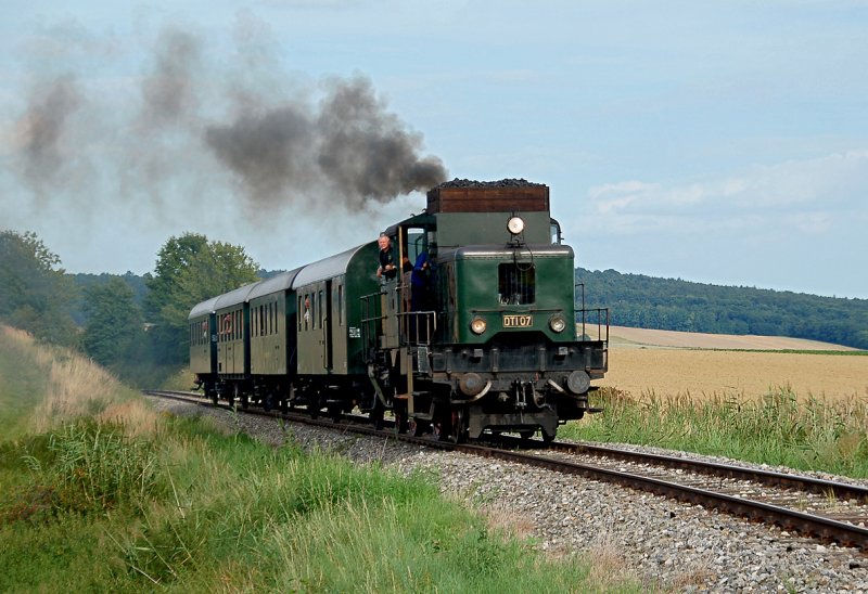Der Dampftriebwagen DT 1.07 (auch liebevoll "Dorftrottel" genannt) bewältigt am 10.08.2008 im Rahmen einer Nostalgiefahrt zwischen Ernstbrunn und Korneuburg die Steigung kurz vor Karnabrunn. (zum Bild)