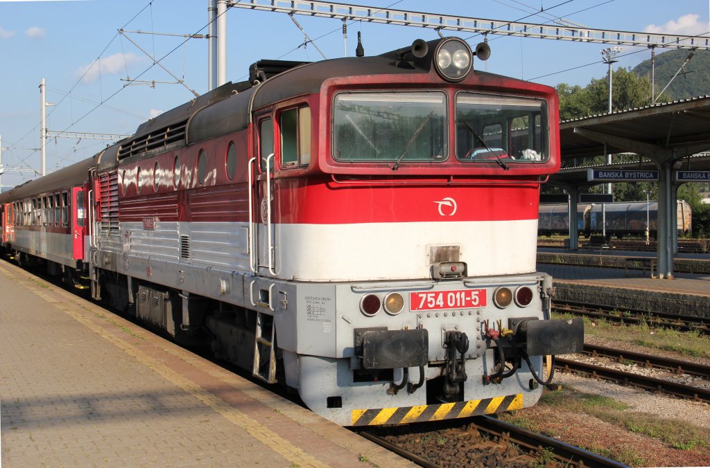 754 011-5 ∙ Sog. „Taucherbrille“ der ZSSK mit Regionalzug Os 7357 von Brezno/Bries nach Zvolen os. st./Altsohl Persbf., während Aufenthalt in Bf. Banská Bystrica/Neusohl. Nächster Halt: Banská Bystrica mesto/Neusohl Stadt; 02.09.2011 (naar de afbeelding)