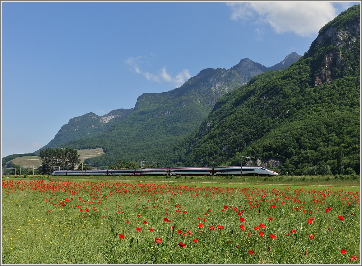 Vorbei an einem Mohnblumenfeld fährt der EC 32 zwischen Yvorne und Roche (VD) in Richtung Genf. (27.05.2015) (voir l'image)