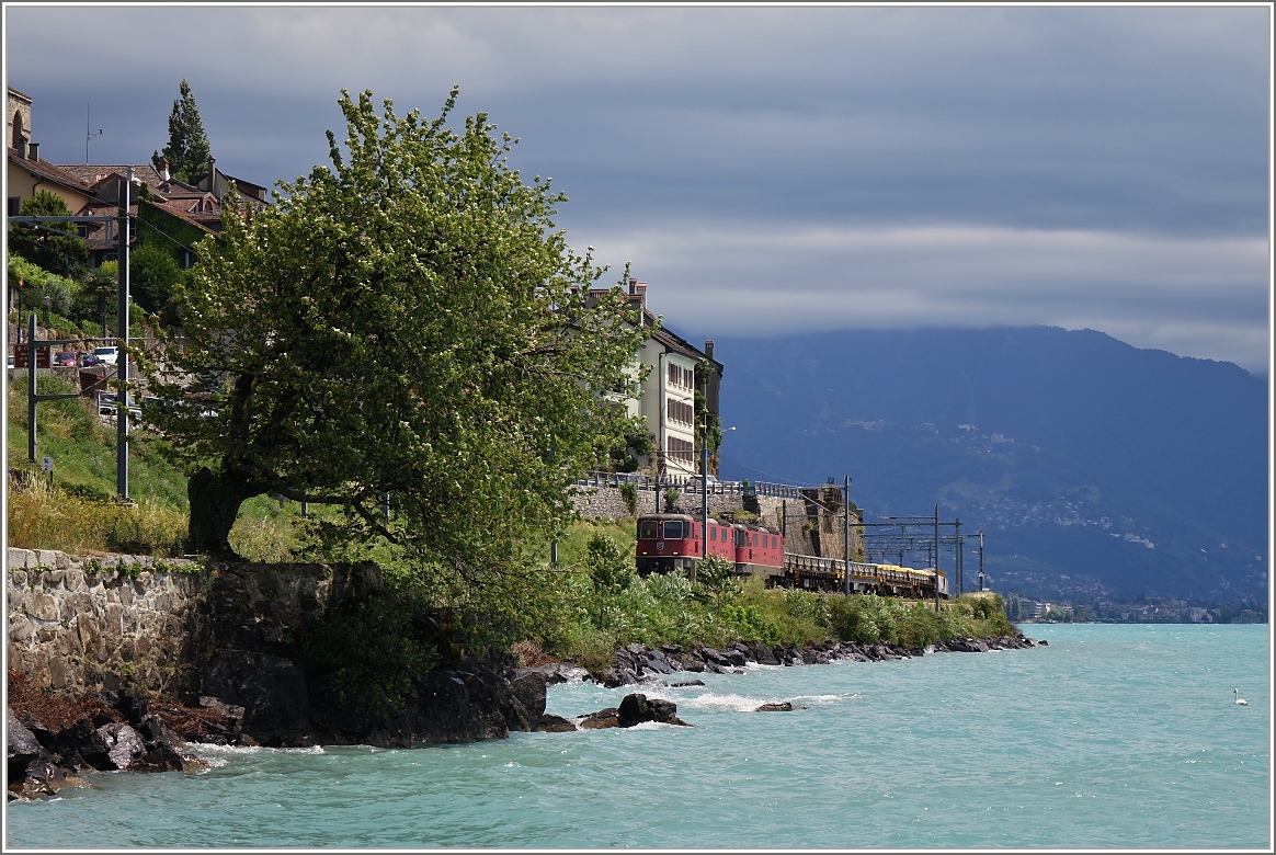 Zwei Re 4/4 II fahren mit einem Güterzug bei St.Saphorin vorbei. (08.07.2015) (voir l'image)