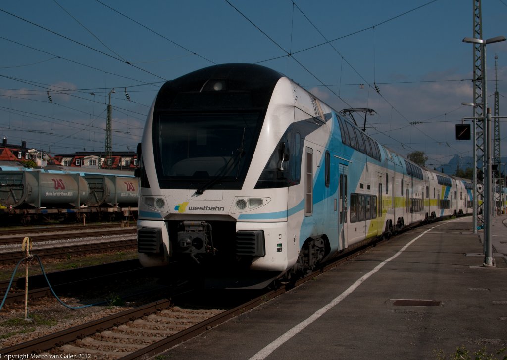 Ein Westbahn Kiss/Duplex Stadler, hier mit REX von Wien nach Freilassing, bei Einfahrt von Freilassing am 14 sept 2012. (naar de afbeelding)
