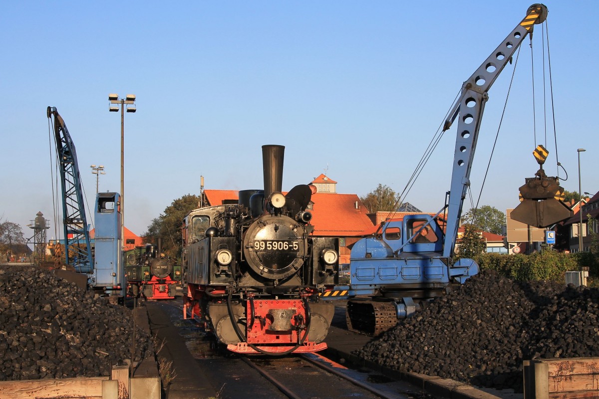 99 5906 am 17.10.2014 auf der Wartungsgrube im Bahnhof Eisfelder Talmühle. Hier wird die Lok entascht und durchgesehen, worauf sie mit ihrem Sonderzug der IG HSB, heute unterwegs von Wernigerode nach Gernrode, die Fahrt fortsetzen kann. (Bild 2) (zum Bild)