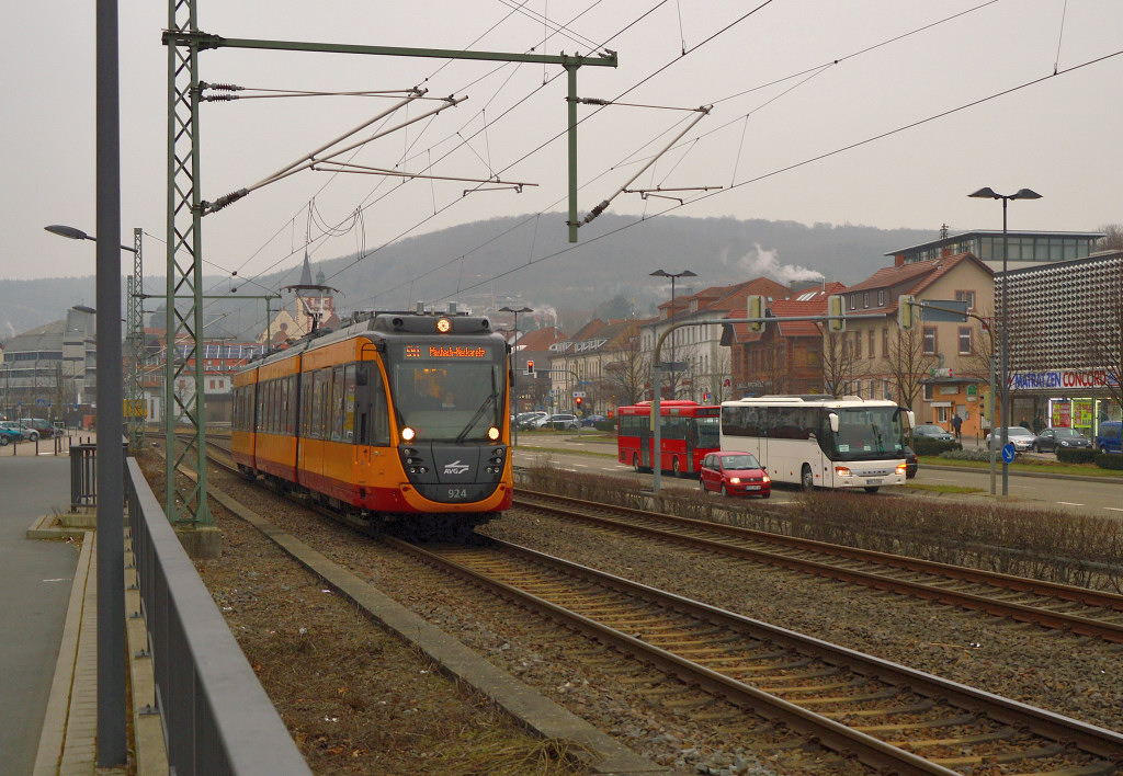Grade verlässt der AVG Triebwagen 924 Mosbach Baden in Richtung Neckarelz als S41 am Rosenmontag den 16.2.2015 (zum Bild)