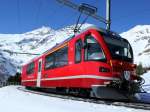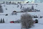 Ein Allegra Triebzug aus Tirano mit einem RE nach St.Moritz stiebt durch den Schnee nach dem Bf Hospizia Bernina.Bild vom 25.1.2015 (zum Bild)