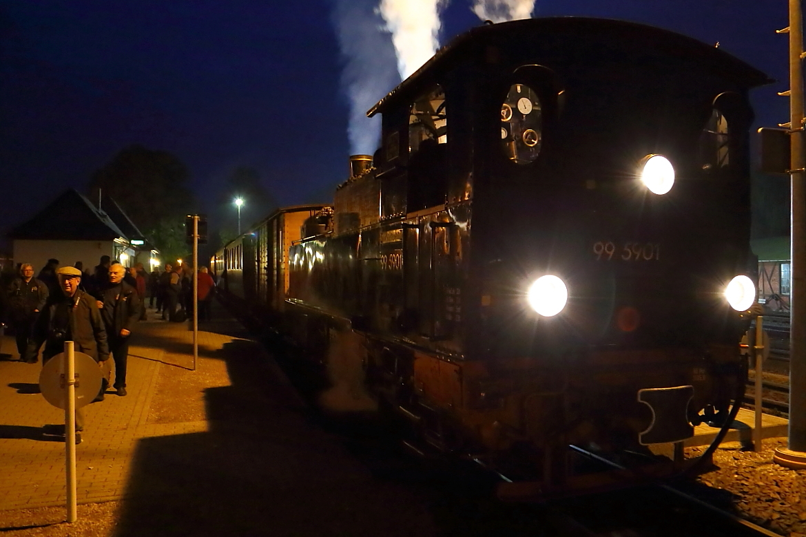 Dies ist nunmehr wieder mein letztes Bild von der Sonderzugfahrt der IG HSB am 23.10.2016. Es ist bereits dunkel, als 99 5901 den Zug wohlbehalten wieder zurück nach Gernrode gebracht hat. Müde, aber mit zufriedenen Gesichtern und gut gefüllten Speicherkarten streben die Fahrgäste nun zum Bahnhofsvorplatz, um per Bus zurück nach Wernigerode zu fahren. Auf dem Vorplatz wartet dann noch eine Überraschung! Für die Rückfahrt hatte der Verein zwei gut erhaltene Schweizer Postautos der Marke "Saurer" organisiert, sodaß dann auch die Heimfahrt in zünftigem Ambiente stattfand (siehe hierzu: http://www.bus-bild.de/bild/Bustypen~Historische+Busse~Saurer/143954/ein-saurer-postauto-alpenwagen-l4c-typ.html und ff. Mein herzlicher Dank gilt, wie immer, den Organisatoren der Fahrt, der IG HSB und der HSB GmbH, der Reiseleitung sowie Zug- und Lokpersonal! Hat wieder alles vorbildlich geklappt!! :-) (zum Bild)