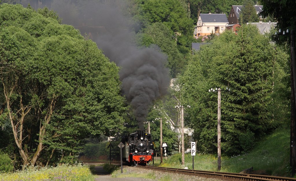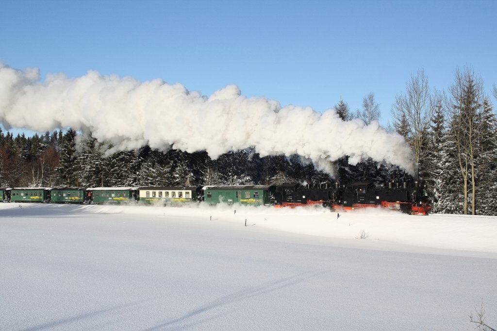 Vorspann auf der Fichtelbergbahn. 99 785 bekommt am 29.12.2010 Vorspannhilfe durch 99 794. Das Bild war auch in der Januarausgabe des Modelleisenbahner abgedruckt. (alla foto)