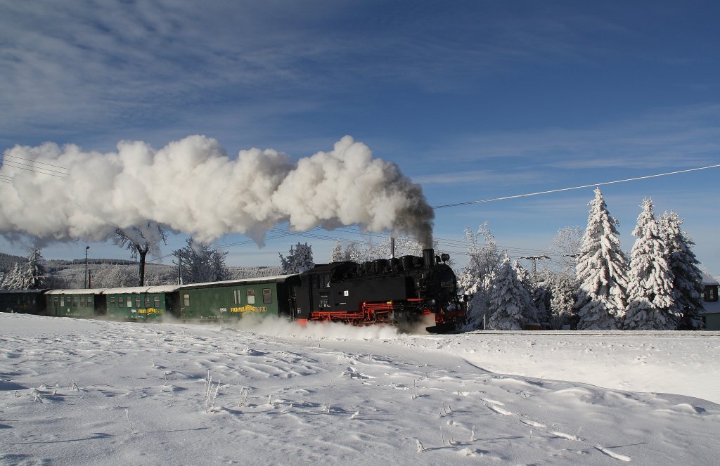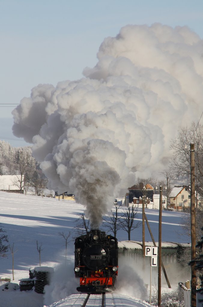 Winterdampf im Erzgebirge, bald ist es wieder so weit. 99 771 hat am 13.01.2010 lautstark den Bahnhof Kretscham-Rothensehma in Richtung Oberwiesenthal verlassen. (alla foto)