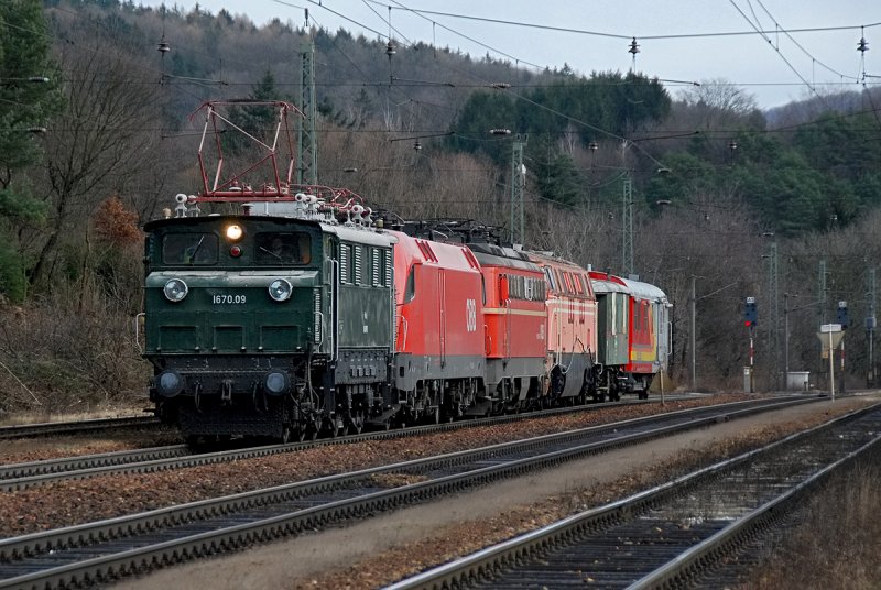 1670.09 schleppt den Hilfszug (Sgag 95796), bestehend aus 1016.046, 1142.566 und 2020.001. Das Foto entstand am 06.12.2008 in Tullnerbach - Pressbaum. (alla foto)