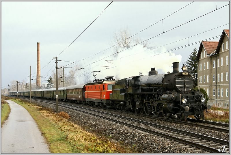 Dampflok 310.23 & E-Lok 1044 040 fahren mit dem Sonderzug 16801 von Wien Süd nach Mürzzuschlag zum Mürzer Christkindlmarkt. Gloggnitz 8.12.2008 (alla foto)