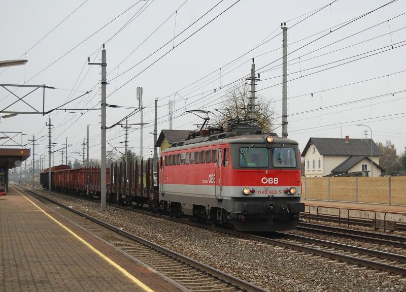 Die Bahnhofsuhr in Marchtrenk zeigte 13h54 an am 25.10.2008 als die 1142 628 mit einem kurzen Güterzug durchgefahren ist. (alla foto)