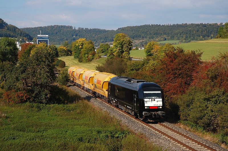 ER 20-013 bringt am Nachmittag des 27.09.08 4 gelbe Josera-Silowagen über die Brenzbahn (KBS 757) nach Blaubeuren-Merkle, aufgenommen bei Oberkochen. (alla foto)