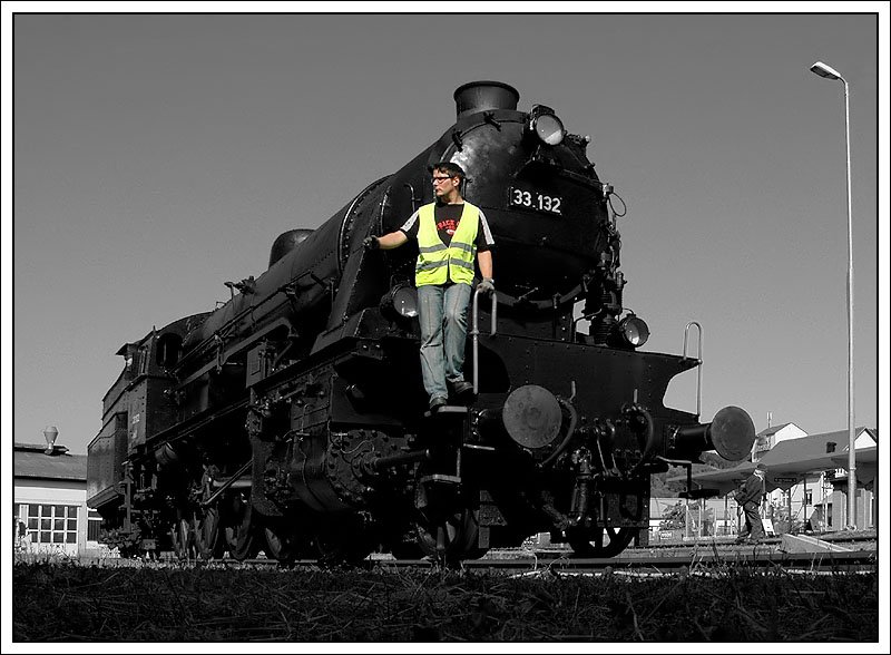 Dampflok 52.4984 Die Eberhard spiegelt sich in einer Pfütze.Auf Wunsch von Johannes und René nun in Farbe. Knittelfeld 23.05.2007 (zum Bild)