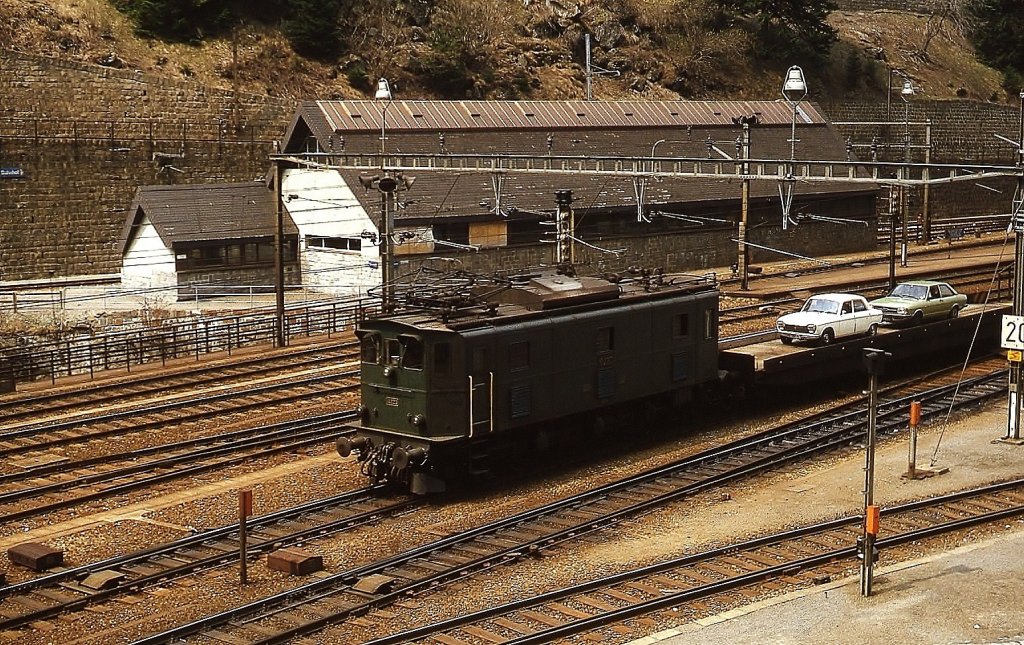Ae 3/5 10222 wartet im Mai 1980 mit ihrem Autopendelzug in Göschenen auf den Abfahrtsauftrag (zum Bild)