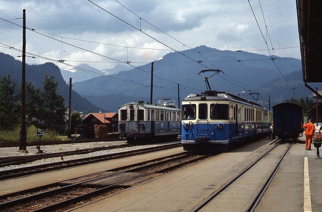 Ein ABDe 8/8 fährt im Mai 1981 in den Bahnhof Gstaad ein. Im Hintergrund BDe 4/4 20, der an diesem Tag mit einer Gleisbauarbeiterrotte unterwegs war (zum Bild)