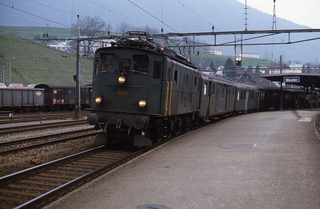 Mit einem Personenzug macht sich Ae 3/5 10202 im Mai 1980 auf den Weg von Moutier nach Delemont (zum Bild)
