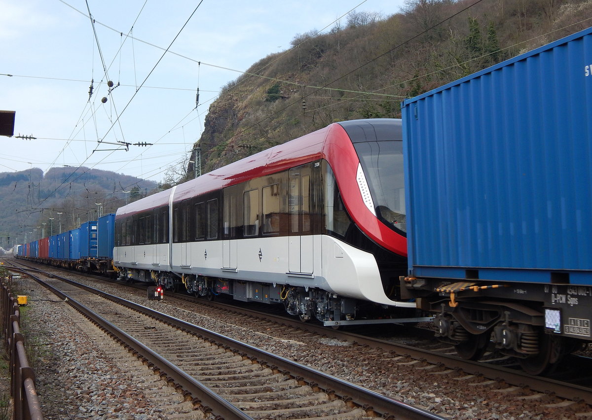 Sehr futuristisch sah die U-Bahn für Riad in Saudi Arabien aus die amm 2.4.16 von PCW7 und PCW8 durch Linz am Rhein gezogen wurde. Linz am Rhein 02.04.2016 (zum Bild)