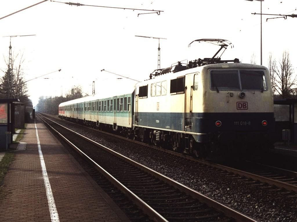 111 018-8 mit RB 42 Haard-Bahn 12250 Münster-Essen auf Bahnhof Albachten am 27-02-2000. Bild und scan: Date Jan de Vries. (zum Bild)