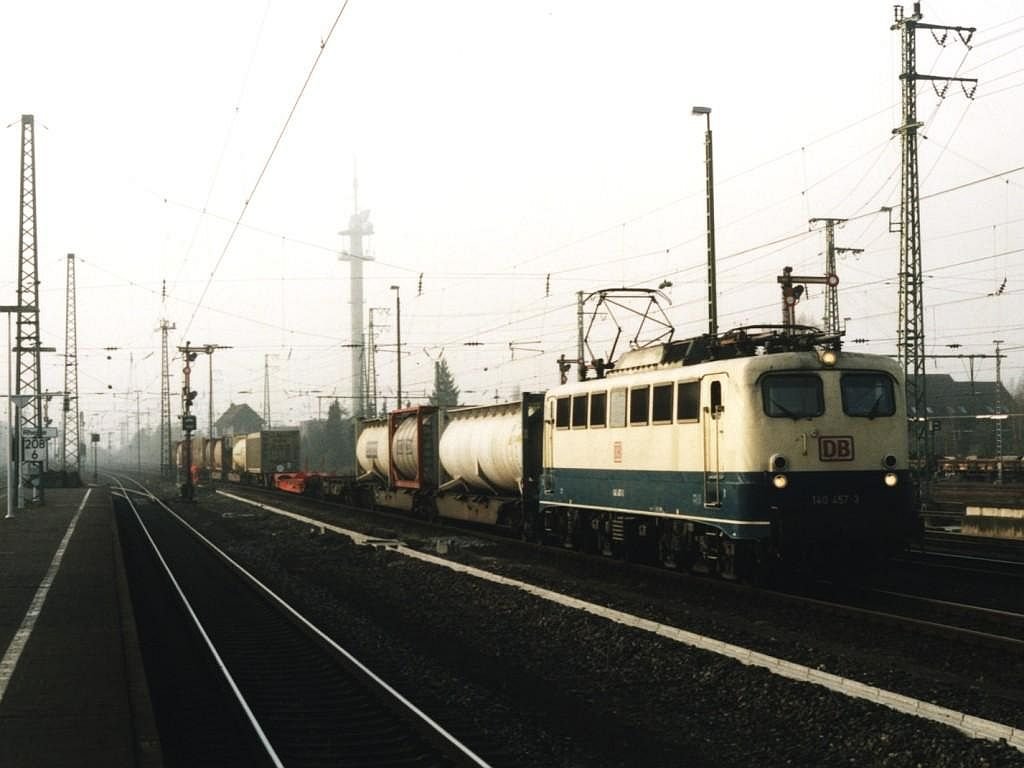 140 457-3 mit eine Güterzug auf Bahnhof Rheine am 21-4-2001. Bild und scan: Date Jan de Vries. (zum Bild)
