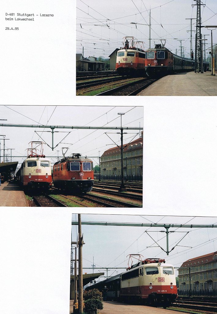 EinBlick in mein Fotoalbum: D 481 Locarno - Stuttgart beim Lokwechsel in Singen am 29. April 1995 (zum Bild)