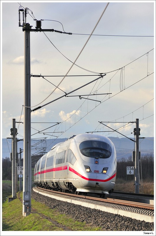 ICE 725 auf der Schnellfahrstrecke Köln-Rhein/Main, Richtung Frankfurt. Nähe Weilbach beim Flughafen Frankfurt; 01.04.2010. (zum Bild)