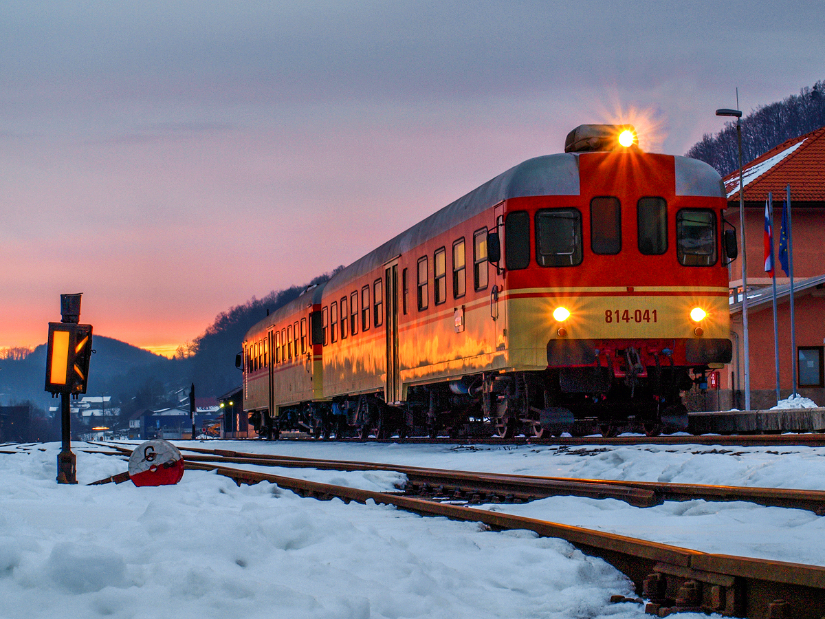 Mit dem Fahrplanwechsel im Dezember 2014 wurde der Verkehr auf der grenzüberschreitenden Nebenstrecke zwischen Djurmanec (Kroatien) und Rogatec (Slowenien) nach siebzehn Jahren wiederaufgenommen. Derzeit verkehren auf dieser Strecke zwei Zugpaare, welche mit den slowenischen Triebwagen der Baureihe 813/814 von der Zugförderung Celje aus bedient werden. Neben großsteils modernisierten Einheiten kann man mit großer Wahrscheinlichkeit auch Triebwagen im Originalzustand antreffen, welche stark an die italienischen ALn 668 anlehnen. Vier von ihnen wurden im Laufe des Jahres 2014 grunderneuert, behielten aber ihr ursprüngliches Erscheinungsbild. Eine der modernisierten Einheiten ist der 813/814 041, hier zu sehen am späten Nachmittag des 05.01.2015. im Bahnhof von Rogatec, kurz vor der Abfahrt als Zug 7813 ins kroatische Djurmanec. (zum Bild)