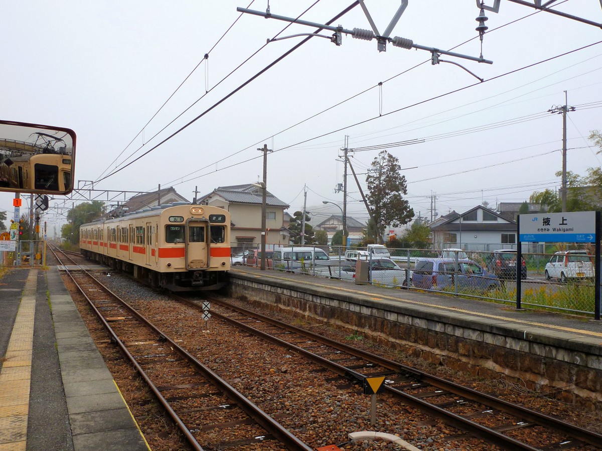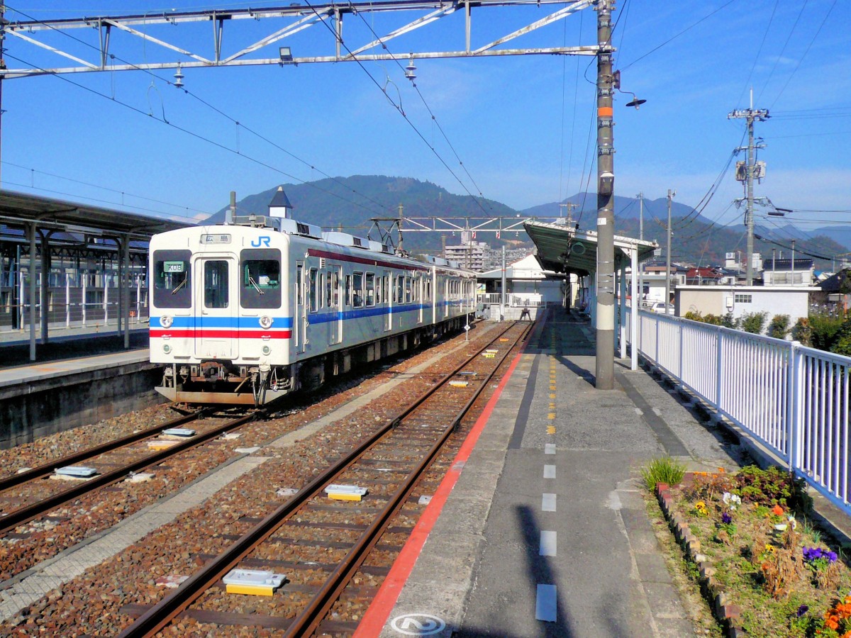 Serie 105 (4-türig): Um den Bestand an einfachen Gleichstromzügen zu erweitern wurde 1984 die Gelegenheit genutzt, im Tokyo-S-Bahnverkehr nicht mehr benötigte Zehnwagenzüge auseinanderzunehmen und als Zweiwagenzüge in die Serie 105 einzugliedern. Diese Züge haben 4 Einstiegstüren. So entstanden für westjapanische Lokallinien 30 weitere Steuerwagen und 32 weitere Motorwagen mit Führerstand; ein Teil der Steuerwagen sind ent-motorisierte alte Zwischenwagen mit neuen Führerständen. Im Bild fährt ein Zug mit Steuerwagen KUHA 105-13 und Motorwagen KUMOHA 105-523 in Wakigami in den Bergen der Kii-Halbinsel südlich von Osaka ein. KUHA 105-13 ist ein Original-Steuerwagen (Serie 103-1000) des S-Bahnbetriebs Tokyo. An einem nebligen 3.Dezember 2012. (naar de afbeelding)