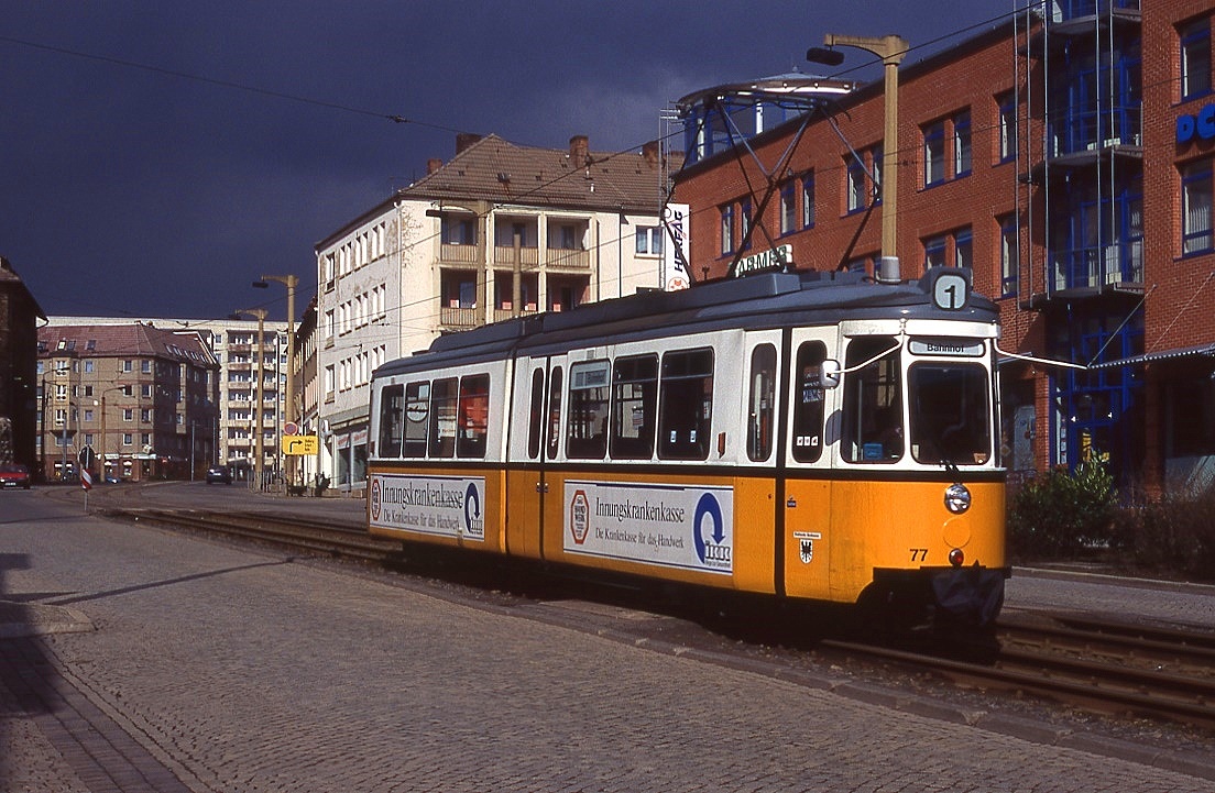 Tja Thomas wohl war. Von mir als Nordhäuser mal ein paar Erklärungen: die richtig großen Veränderungen in dieser Straße kamen erst ab Ende der 90er im Zuge des Stadtumbaus für die Landesgartenschau 2004. Hier mal die Gegenrichtung mit dem gleichen Haus im Hintergrund: http://www.bahnbilder.de/bild/deutschland~strassenbahn~nordhausen/61484/tw-201-am-03062006-ist-gerade.html.