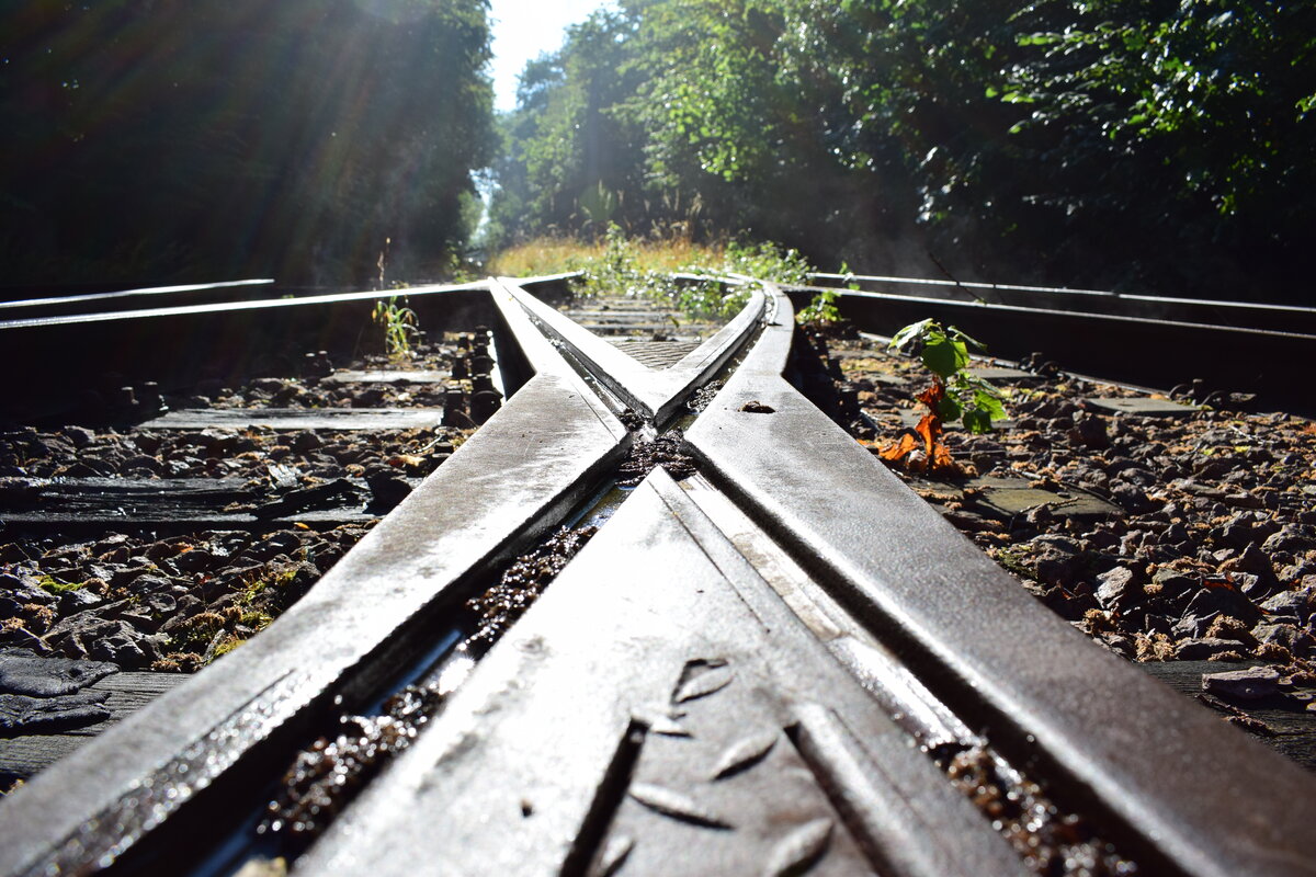 Blick über ein altes Herzstück im stillgelegten und teilweise zurück gebauten Abzweig zur Kreuzbergstraße in Dessau. Dessau 27.07.2020 (zum Bild)