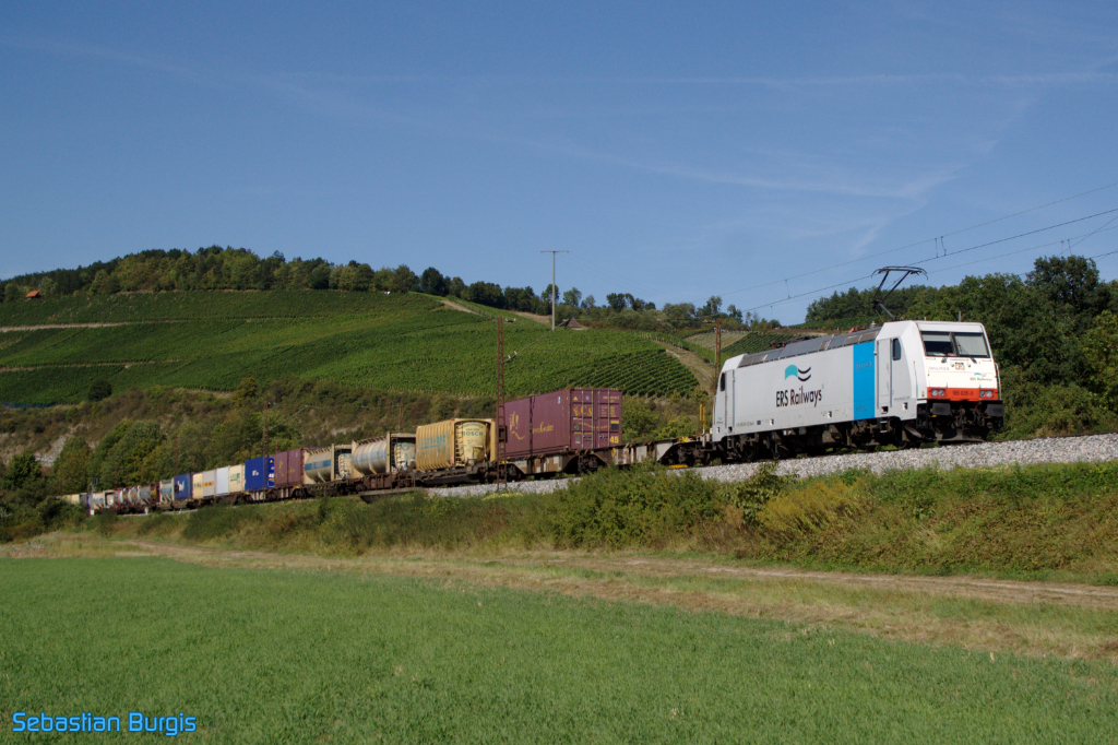 Hätte ich den rechten Rand noch weiter rechts platziert, wären die Wagen eben von einem Mastensalat abgeschnitten worden, so finde ich es besser. Und hätte ich auch noch vorher gewusst, dass diese Lok vorbeikommt, hätte ich auch eine schönere Stelle gesucht...